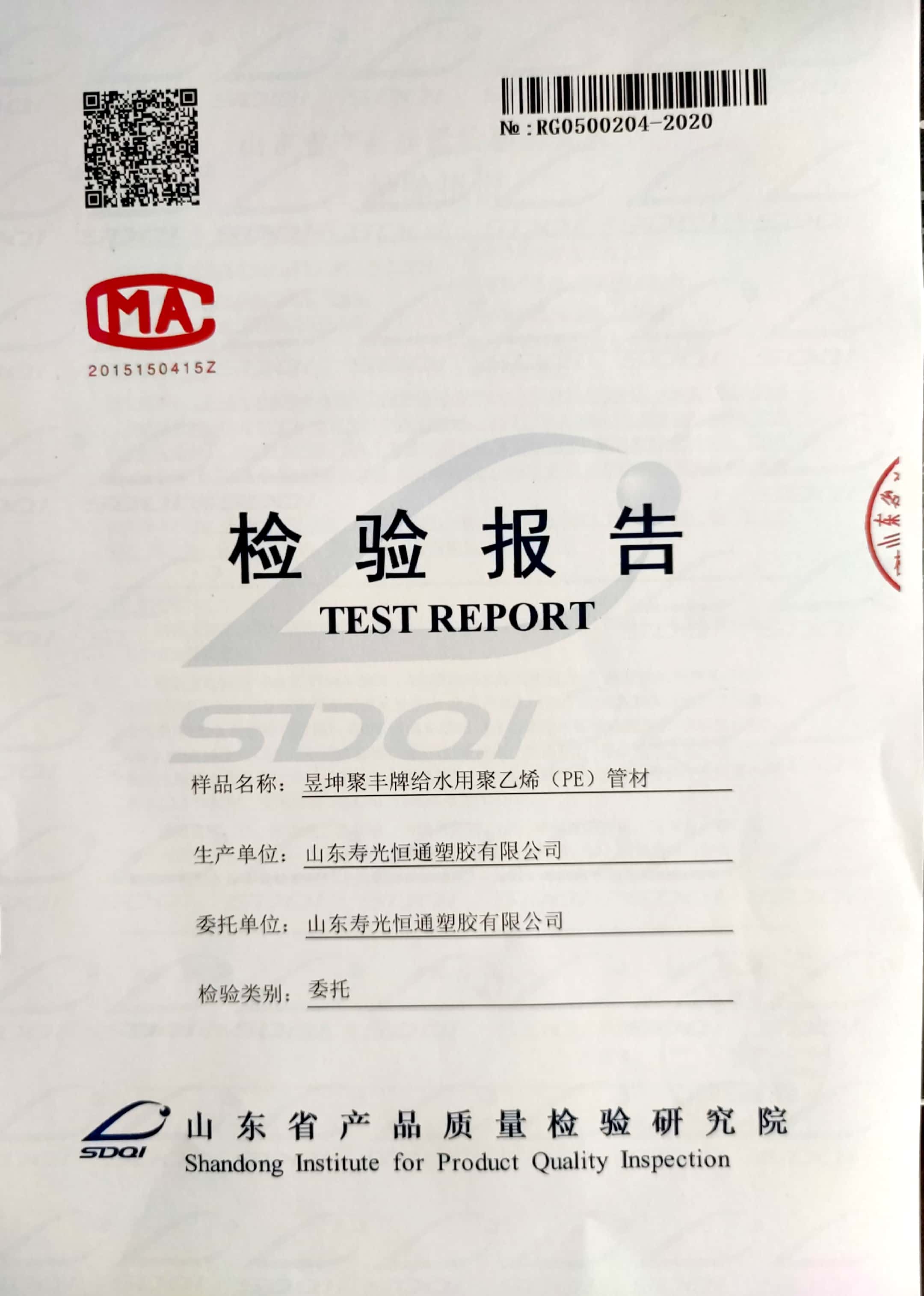 山東恒通塑膠 昱坤聚豐牌 PE給水管 衛(wèi)生檢測報告PVC排水管、PVC供水管、PPR管、PE管、地暖管、灌溉管