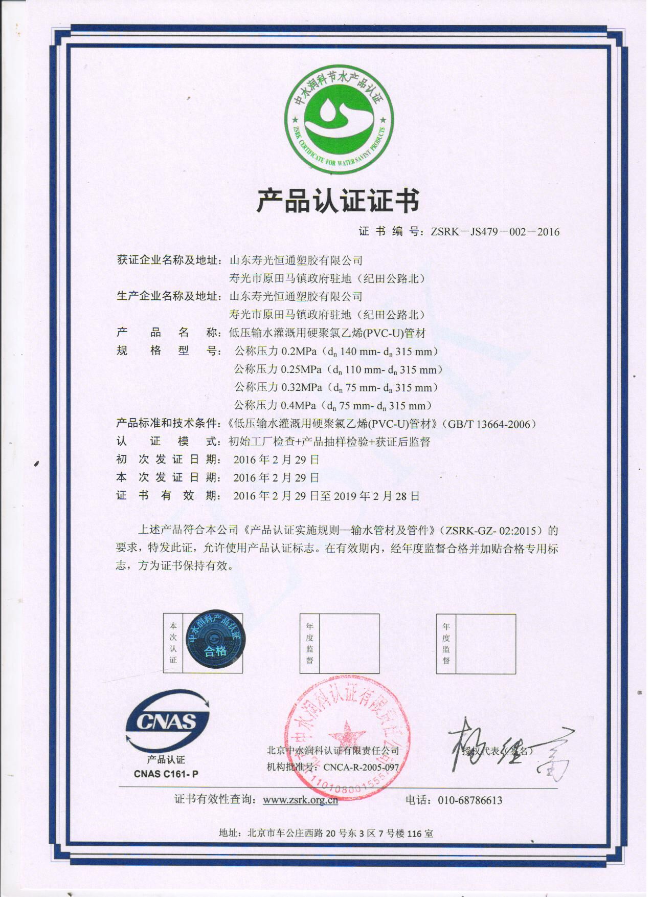 低壓輸水灌溉用PVC-U管材北京中水認(rèn)證證書