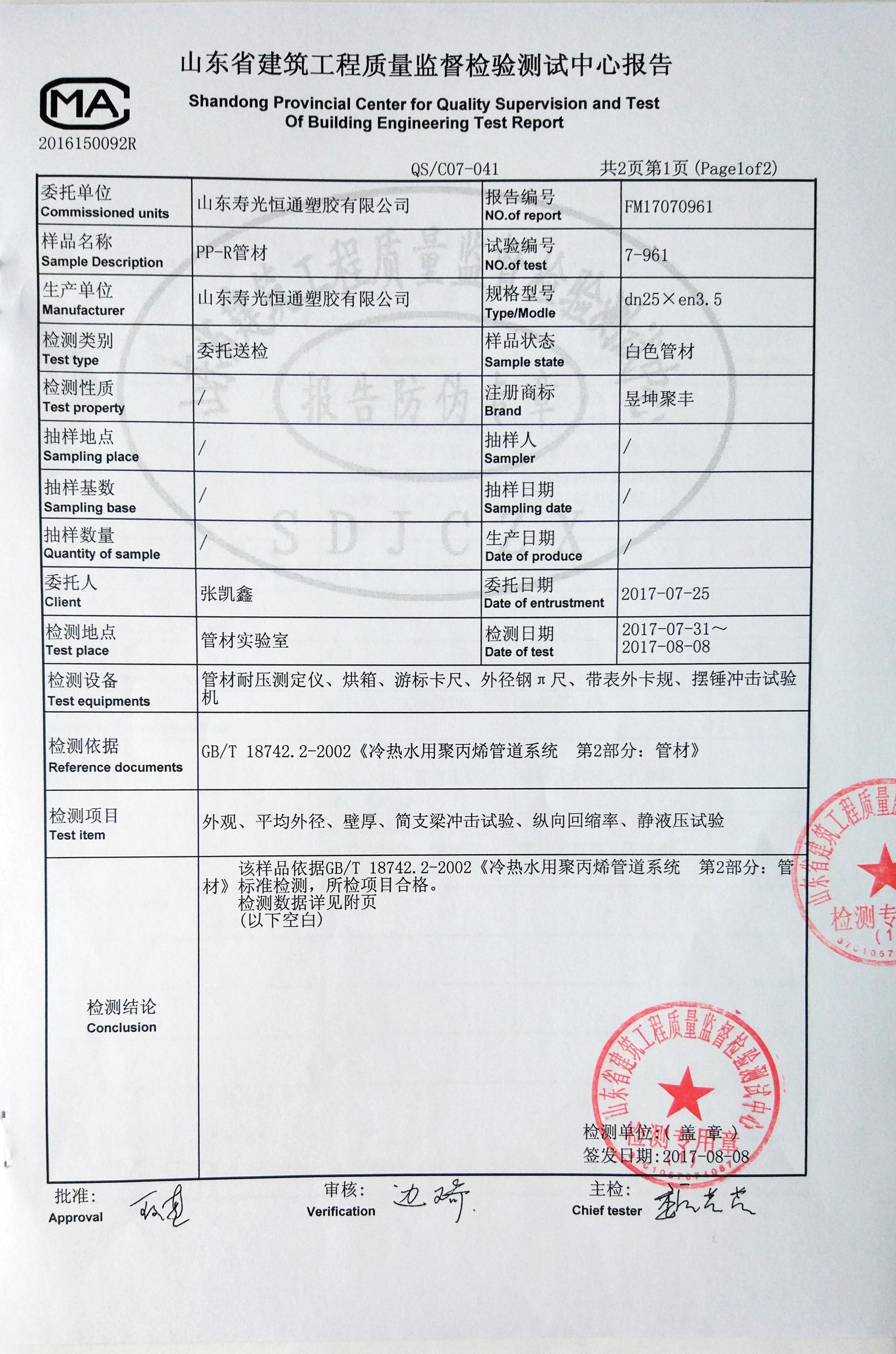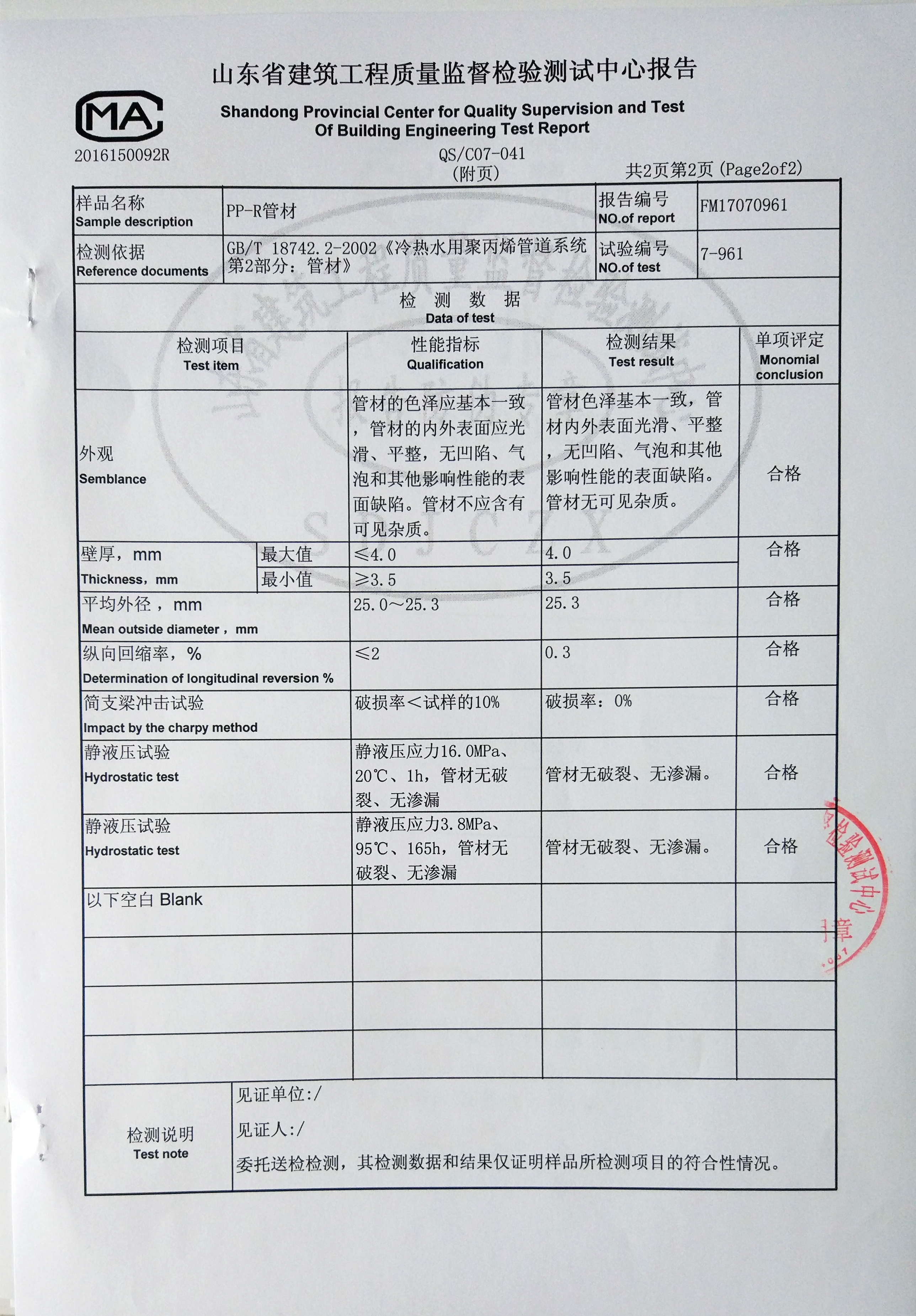 PP-R冷熱水山東省檢測(cè)報(bào)告